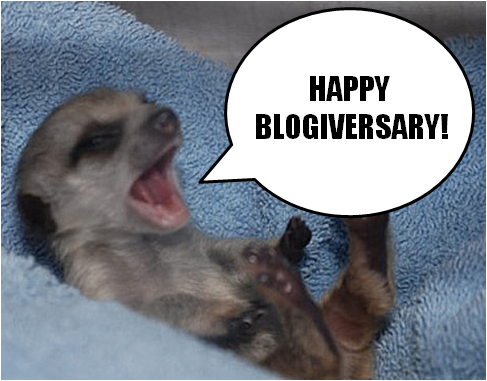 What better way to celebrate than to post a picture of a meerkat wishing me a happy day? I think that’s a meerkat, anyway.